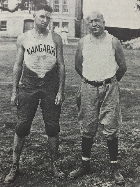 From Creighton: “If Mr. Bridges, coach of the Baylor team, could have seen the Kangaroos as they filed into the Cotton Hotel, he doubtless would have chartered a special interurban and returned from Dallas where he had gone to scout. Baldheaded as goats, their faces scratched and covered with bruises, the Kangaroos had the long, hungry look of a team which had come to play.” The raucous Cotton Palace crowd that came to witness an easy Baylor win quickly realized their enthusiasm was misplaced.