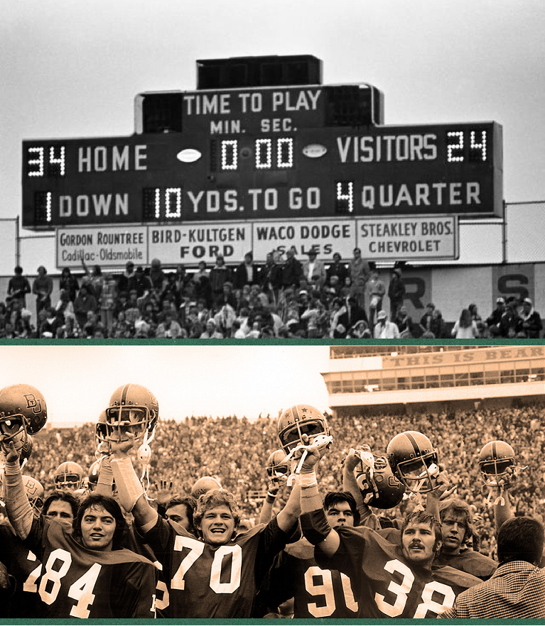 Arkansas fell in Fayetteville, and TCU lost in Fort Worth. It seemed academic at the time, as Darrell Royal’s Longhorns were headed to Waco on November 9th. Texas had won 6 conference championships in a row, alongside two national crowns in 1969 and 1970. Baylor had not beaten the Horns since 1956, and it appeared that nothing was going to change when UT took a 24-7 lead into halftime.