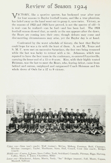 Grigg was still playing professional football in 1924, another year of progress for the Baylor Bears in their effort to establish themselves as a 1920s Southwest Conference power. The Bears in the SWC were every bit as dominant as the Bulldogs in the NFL during that era. 1924 in particular would be the year when no conference school, large or small, could tame that squad in Waco.