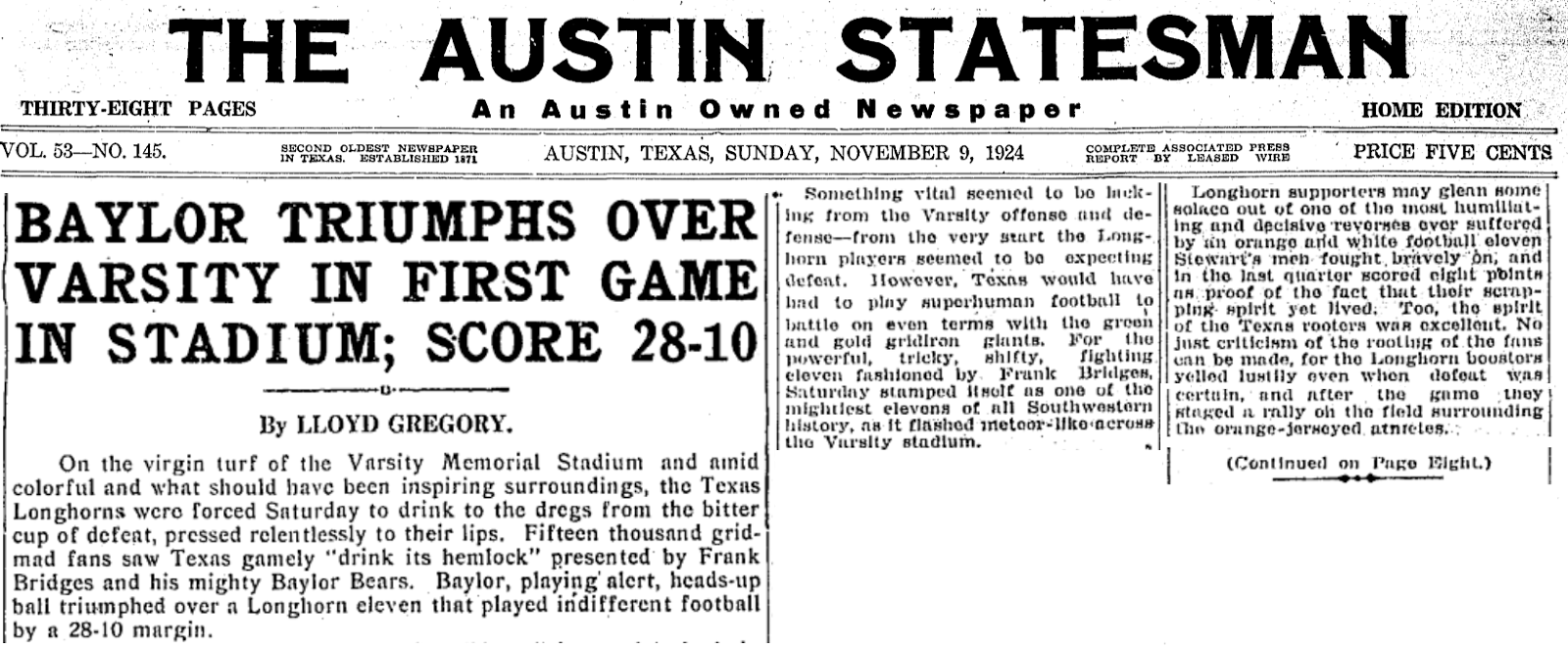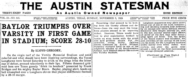 There was little time for Bridges and Baylor to celebrate. Defeating the Aggies at home was an accomplishment, but the following weekend required a road trip to Austin. UT was coming off of an 8-0-1 1923 season, which included a win over Austin College. The Longhorns are always tough at home, and that would certainly be the case on November 8th. The University of Texas was inaugurating a brand new field on November 8th, 1924: the massive Texas Memorial Stadium.