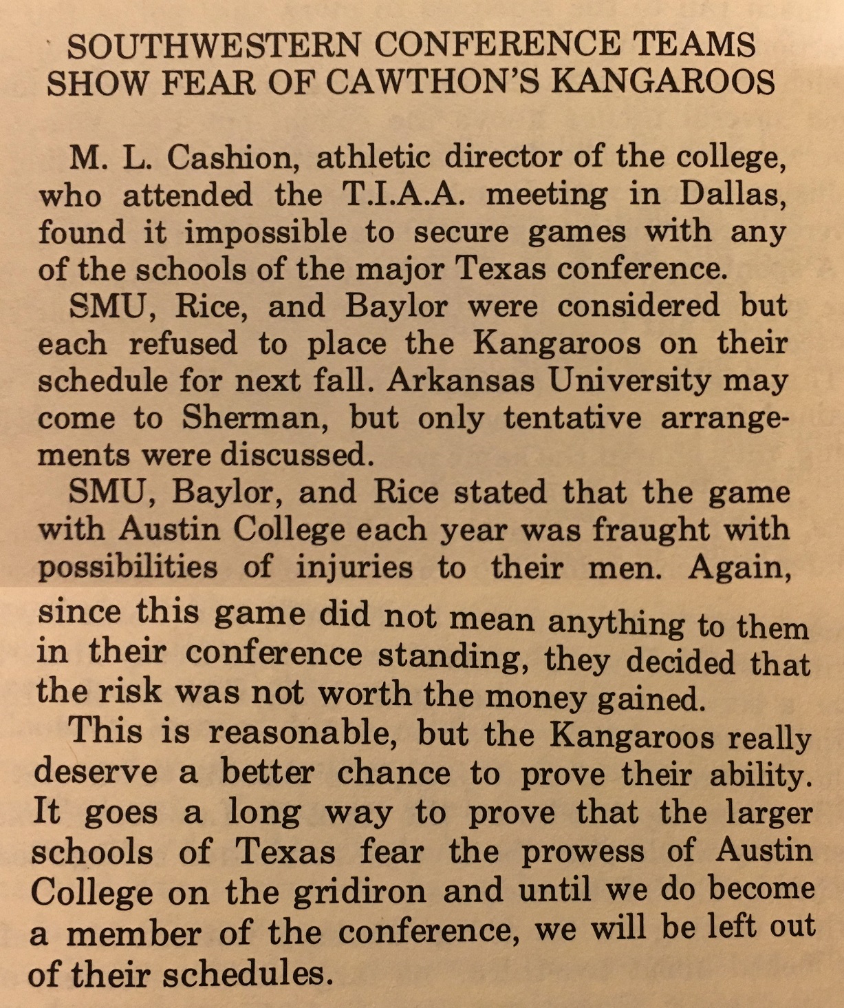 Austin College Athletic Director M. L. Cashion tried in vain to schedule games against SMU, Rice, & Baylor in 1925. All three declined. The risk of defeat was simply too great, and the rewards of a TIAA win were not valuable enough. Membership in the Southwest Conference was suggested by Baylor as a possible solution.