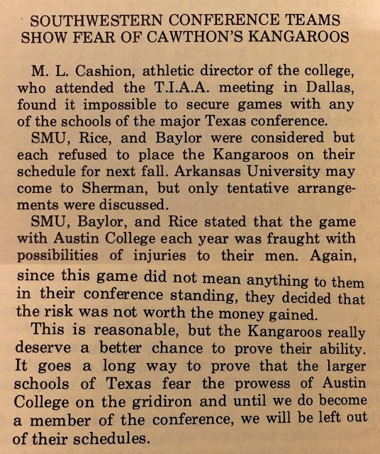 Eventually, games against SMU, Rice, and other SWC schools returned. But only sporadically. And Austin College never again faced Baylor after 1924.