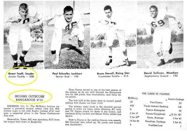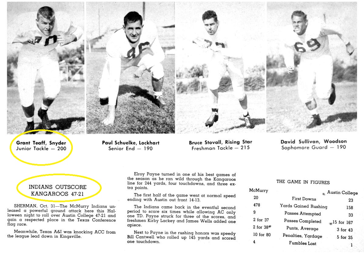 Coach Teaff was an offensive lineman for McMurry in 1953 when the Indians traveled to Sherman to take on the Texas Conference leading Kangaroos. AC stood at 5-0-1 and was led by future NFL RB Gene Babb. But the Roos had no answer for the dominant running game of McMurry at Bearkat Stadium. McMurry 47, AC 21.
