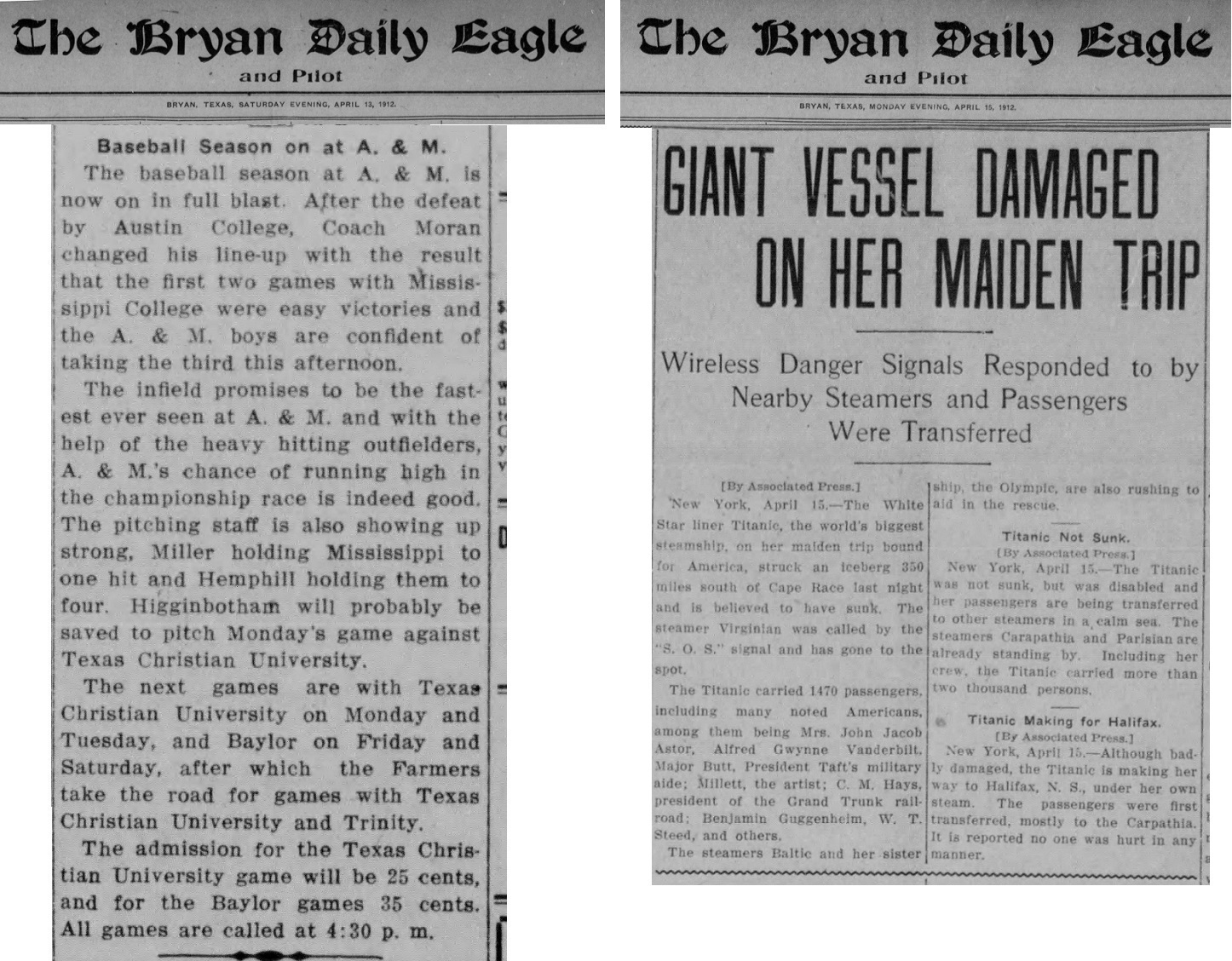 The front page of the April 15th Bryan Eagle 2 days later? An entirely different story. Notice the famously inaccurate early reports of the ship’s fate.