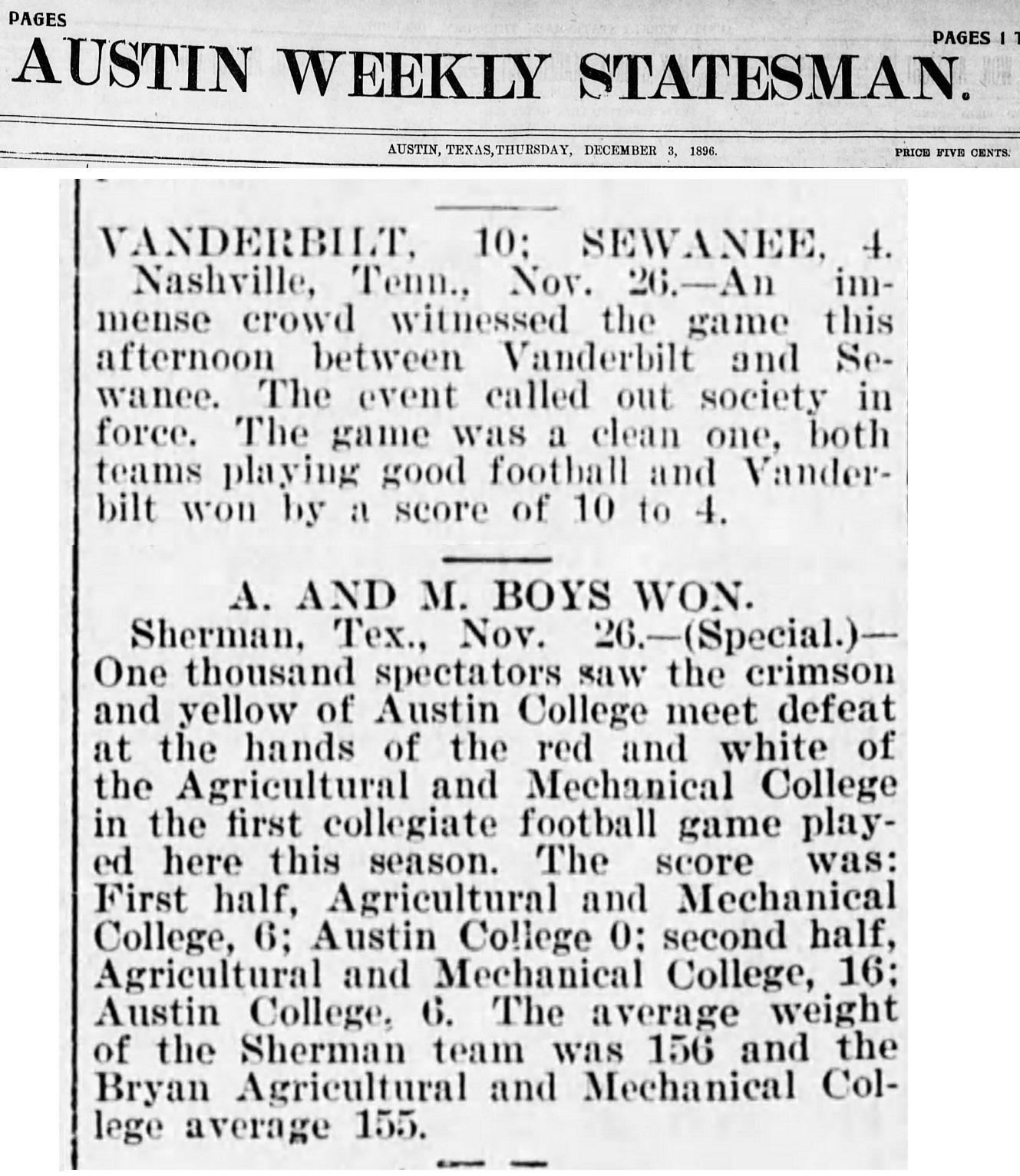 Austin College was the first little giant to join the fray, when the Kangaroos took on Texas A&M in Sherman on Thanksgiving Day, 1896. In doing so, AC became the third school to play football in the state of Texas, behind the Longhorns and Aggies. Texas A&M secured its first ever victory over a college opponent by a score of 26-6.
