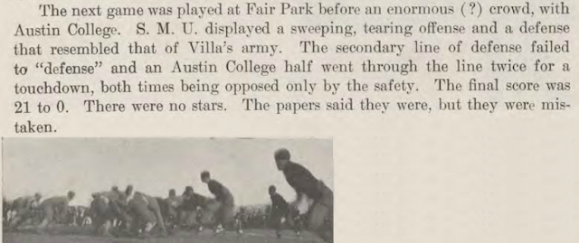 In 1915, Kangaroo football began to show signs of life. After another opening game loss to A&M, the Roos traveled to Dallas Fair Park to face SMU, a new university participating in its first year of athletics. The AC-SMU game was the third in Mustang history, and the first of many games for SMU at Fair Park. It was no contest. Austin College routed the Mustangs 21-0, with Currie and the offensive line leading the way. According to the SMU yearbook, the game was played before an enormous crowd. The Mustang defense against the Roos, in a reference to the legendary elusiveness of the Mexican rebel leader, “resembled that of Villa’s army”.