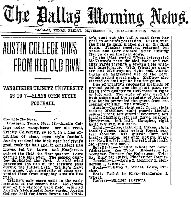 The economic downturn of 1913-14 took its toll on AC admissions and the quality of AC football. The Roos and Currie limped through a difficult 1914 campaign, which included a 32-0 loss to the Aggies at Kyle Field. The Galveston Daily News reported the game on Page 4. Page 1 was reserved for other news in Europe.
