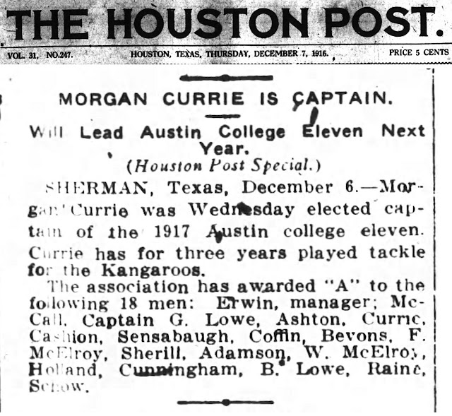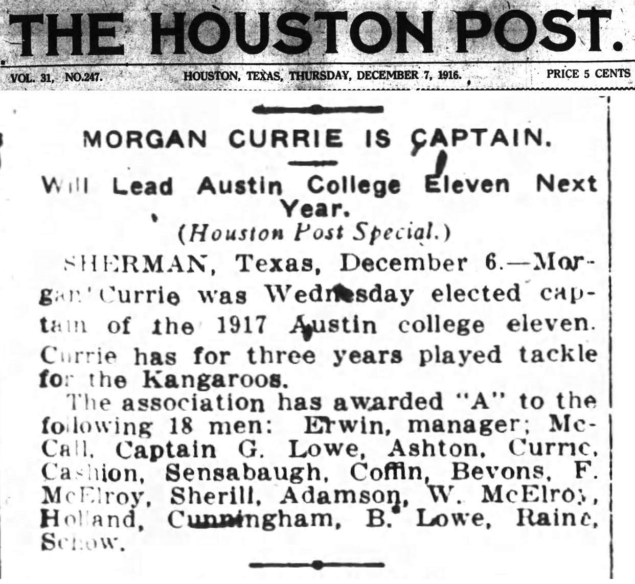 The 1916 campaign was a difficult losing season. But that year included 3 losses to future SWC schools TCU, Rice, and Baylor. More importantly, the freshman on that 1916 team would be seniors by 1919, the beginning of a remarkable era of Roo football dominance. Currie had one season left of eligibility in the fall of 1917, and was expected to return as Captain. But events in Europe changed those plans.