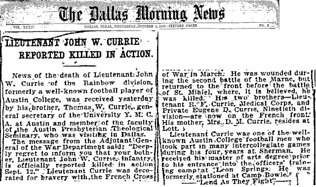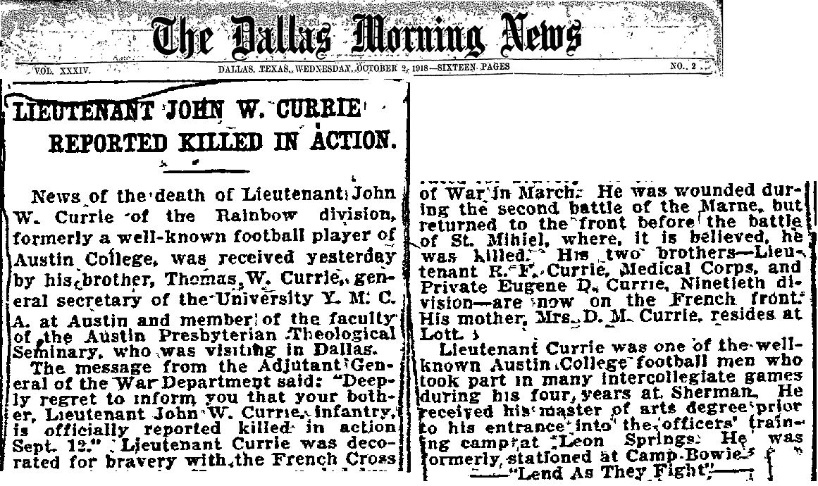 DKR Texas Memorial Stadium in Austin was built in 1924, and was originally dedicated to the Texas men and women who gave their lives during the First World War. They are all honored individually on bronze tablets at the WWI Memorial, located at the NW corner of the stadium. John Morgan Currie’s name is listed. And for those curious, Roo football has played at DKR Texas Memorial Stadium.