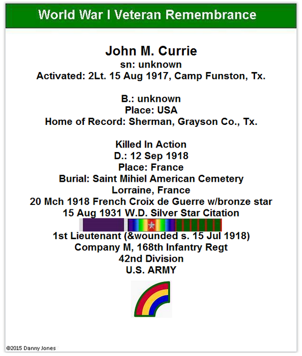 John Morgan Currie was posthumously awarded the Silver Star by the War Department “for gallantry in action near Flirey, France, September 12, 1918. Lt. Currie showed great bravery and skill in handling his platoon in the advance and daringly leading his men against the fire from enemy machine-gun emplacements.”
