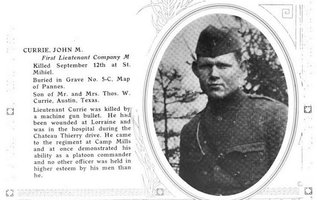 “The remnants of M Company struggled through the first belt of wire fronting the wood. The survivors could almost feel the scorching blast of machine guns, but now at least they had definite targets. An automatic rifleman fell. Another came up, and Lieutenant John M. Currie of Austin, Texas seized his gun and emptied a full clip into an outpost, silencing it. As he handed the chauchat back, a German sniper shot him and he plunged over dead. Almost simultaneously the company commander and another lieutenant were also shot down.”