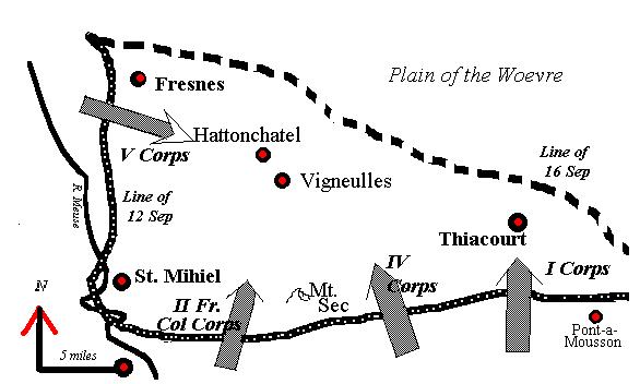 MacArthur began to move the 42nd into place in early September. The assault plan consisted of three corps (II Corps (French), IV Corps(US), & I Corp(US)) attacking from the south, and one from the west. The 42nd was a part of the IV Corps, stretching from the Mont Sec hill in the west to the town of Fey-en-Haye in the east.